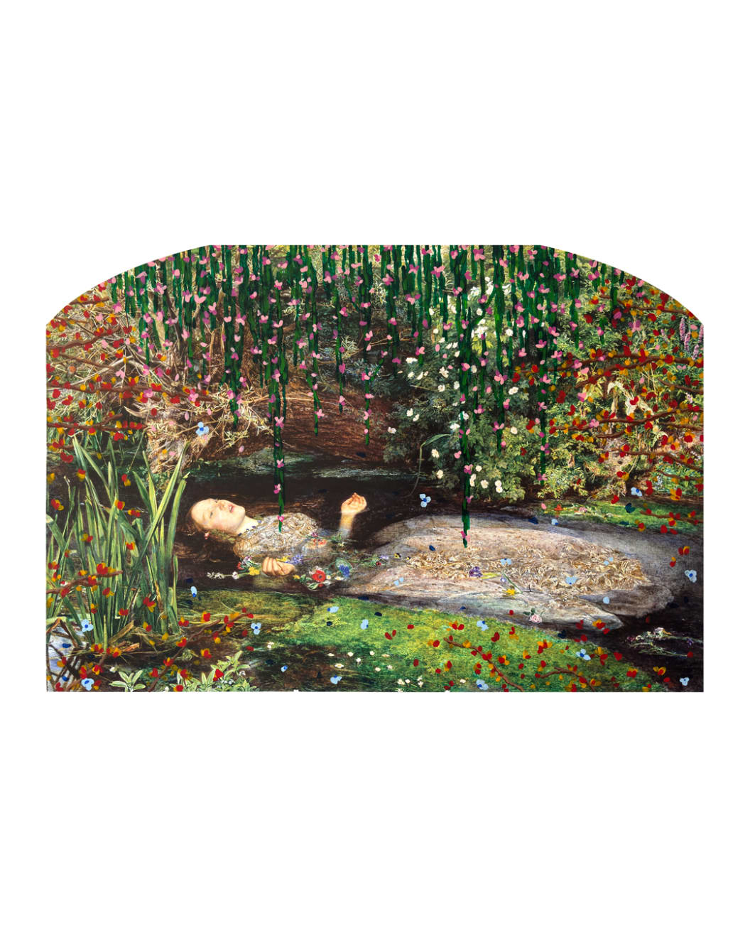 This is one of two Ophelia paintings De Feo made in 2017 as part of his Pre-Raphaelite series, a body of work that developed out of the progression of his earlier "fashion takeover" paintings. Michael's first Ophelia painting sold in 2017; this is the first time the second version is being exhibited and offered for sale.